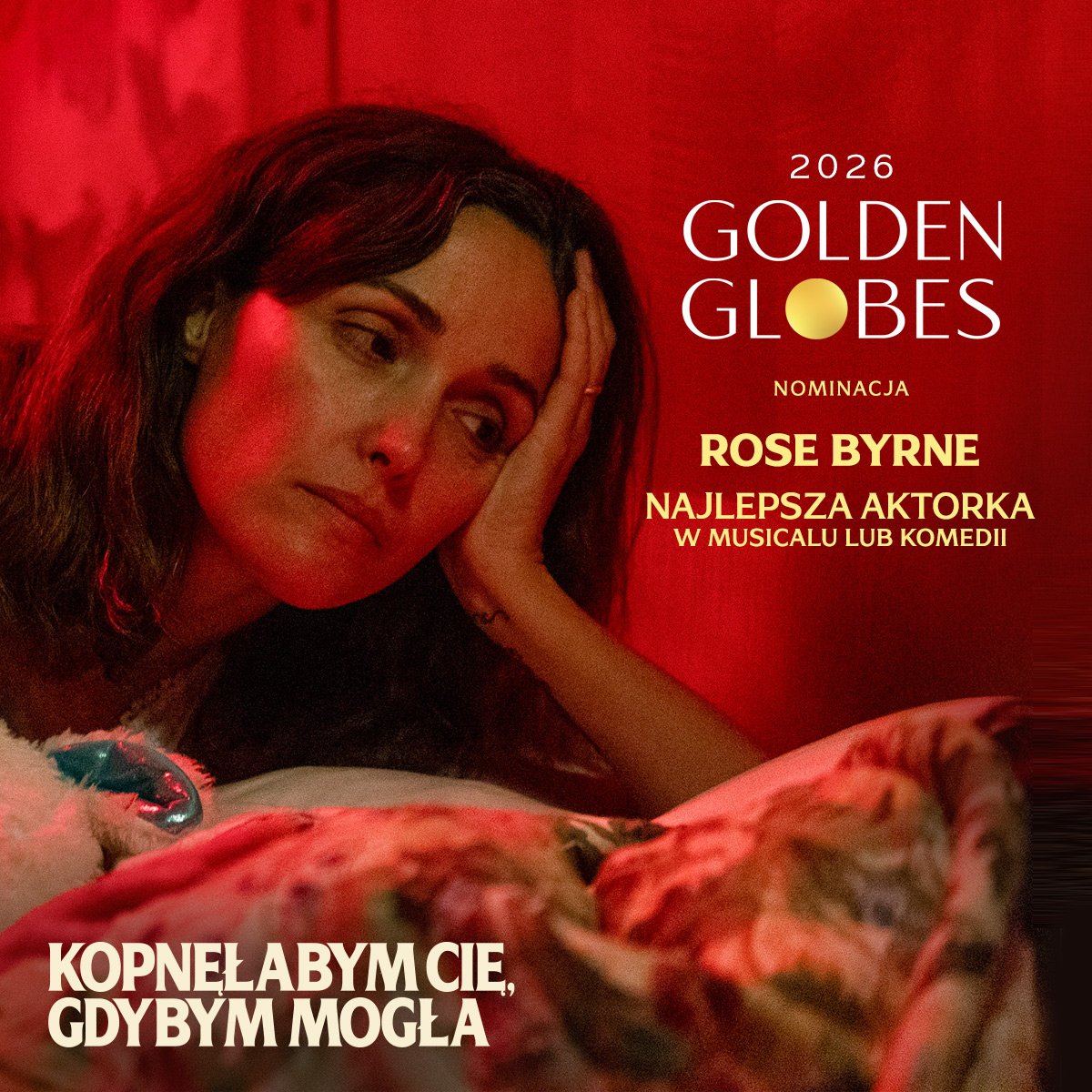 Z radością informujemy, że podczas ogłoszonych dziś nominacji do Złotych Globów Rose Byrne znalazła się w gronie aktorek nominowanych w kategorii Najlepsza aktorka w komedii lub musicalu, za rolę w filmie „Kopnęłabym cię, gdybym mogła” w reżyserii Mary Bronstein.